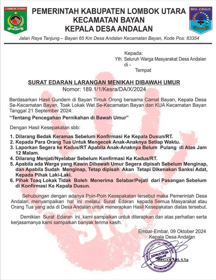 Di Desa Andalan, Edaran No 189.1/1/Kesra/DA/X/2024 tentang Larangan Nikah di Bawah Umur ditandatangani Kades Megawadi, STp tanggal 9 Oktober 2024. Sedangkan di Desa Mumbul Sari surat edaran Nomor 412.2/52/Kesra/MS/X/2024 tentang Larangan Perkawinan Anak ditandatangani Kades Mujtahidin, Amd tanggal 10 Oktober 2024.