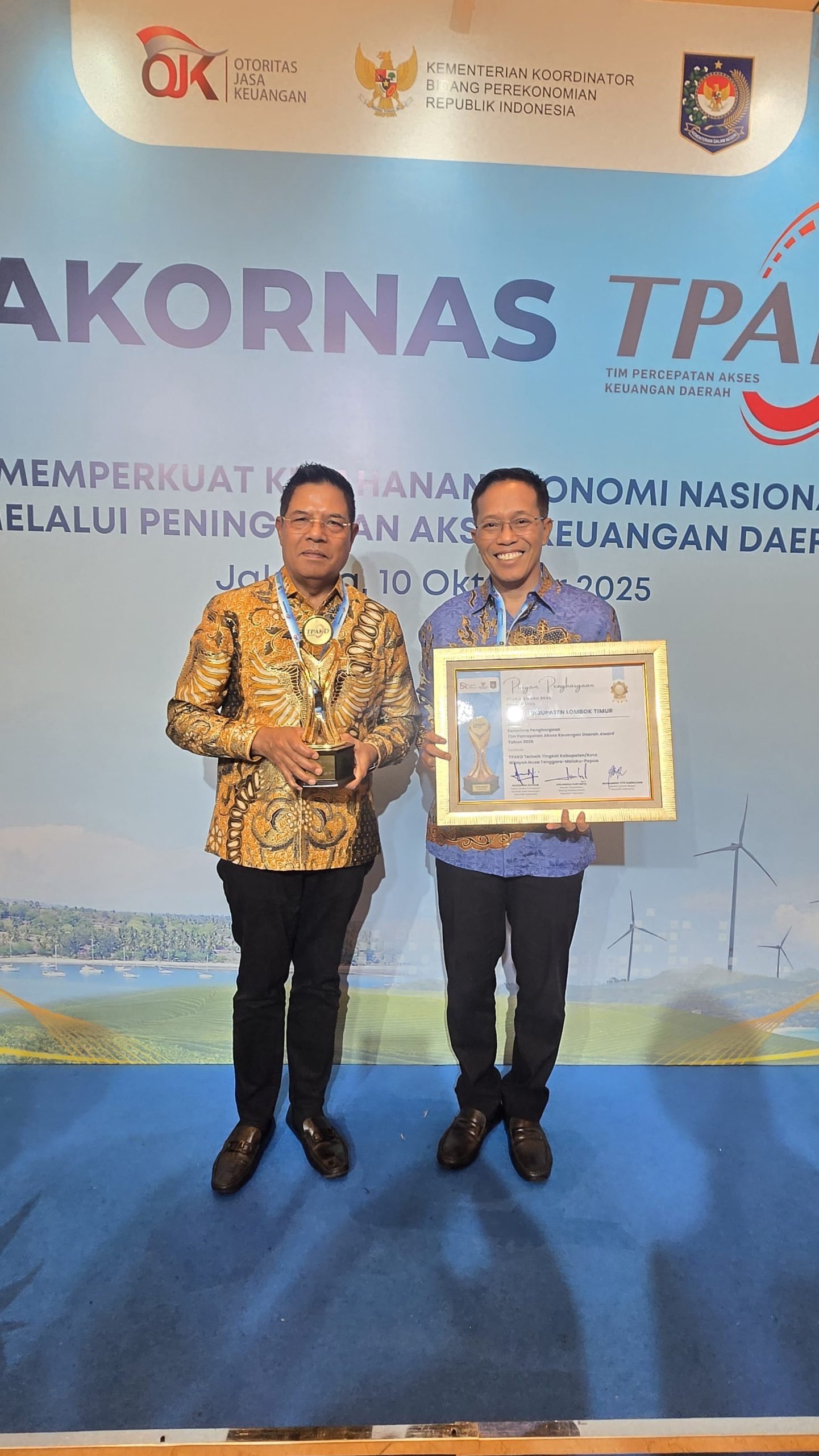 JAKARTA – Kabupaten Lombok Timur berhasil menyabet penghargaan bergengsi Juara I TPAKD Award 2025 untuk kategori daerah dengan Tim Percepatan Akses Keuangan Daerah (TPAKD) terbaik tingkat kabupaten/kota se-Wilayah Nusa Tenggara, Maluku, dan Papua. Penghargaan ini merupakan pengakuan atas komitmen dan inovasi Pemerintah Daerah (Pemda) Lombok Timur dalam mendorong inklusi dan akses keuangan formal bagi masyarakatnya.