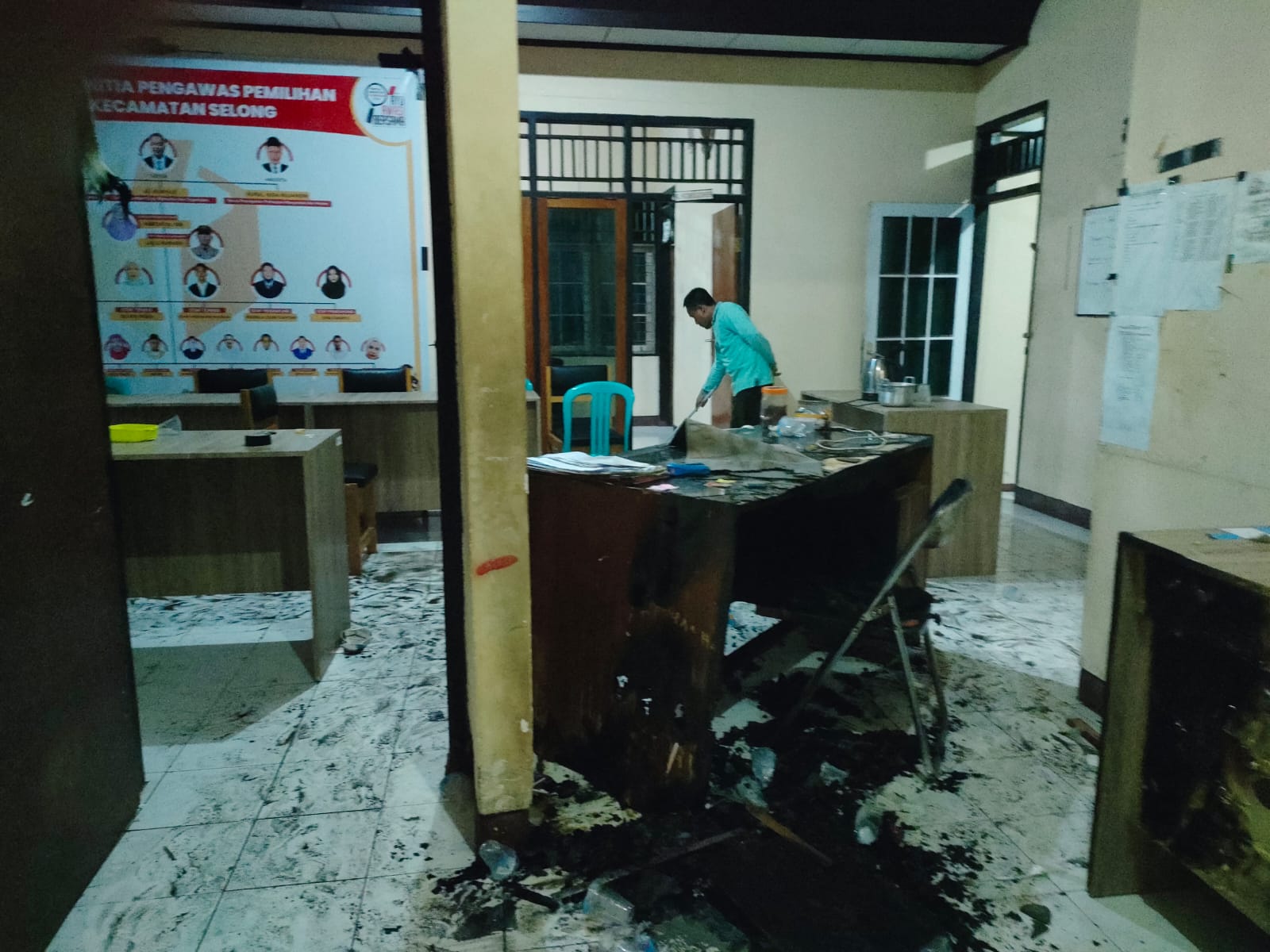 Kemudian seorang pemulung melihat ada api menyala di dalam ruang tengah kantorlalu memberitahu warga sekitarnya dengan langsung ke TKP untuk memadamkan api yang menyala di meja agar tidak merembet ke tempat lainnya.
