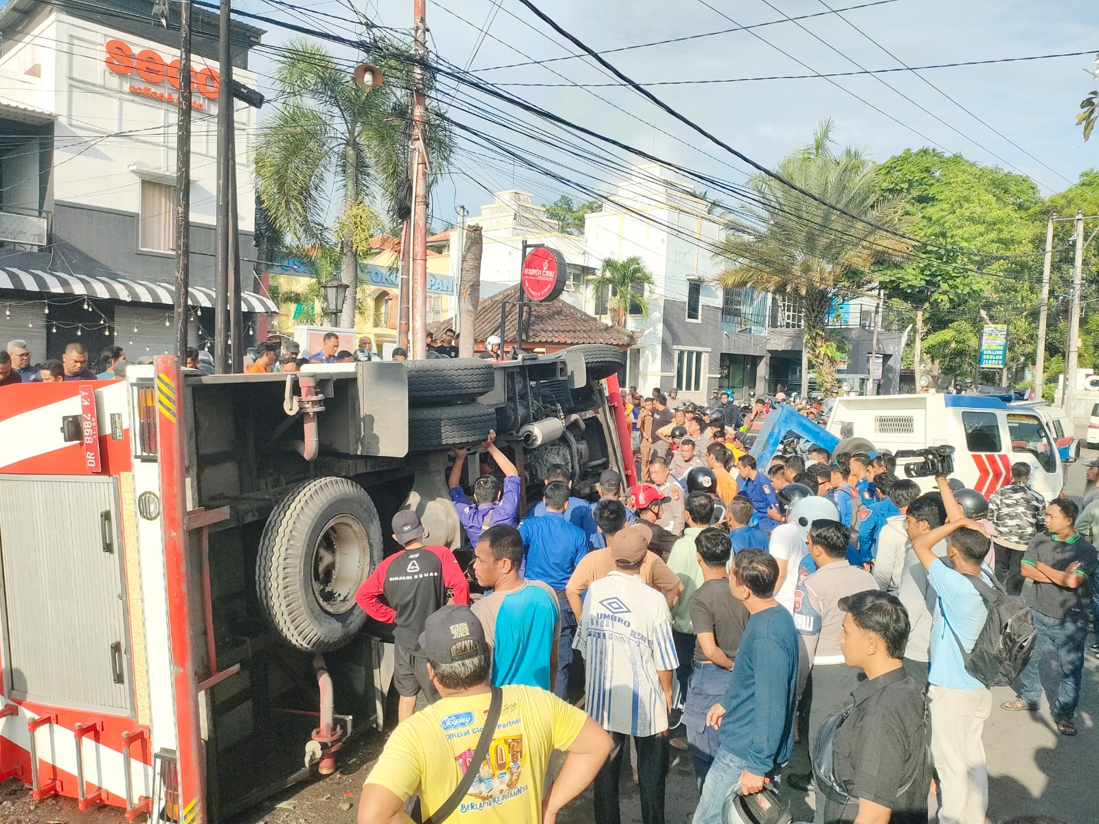 Selong,DS– Mobil pemadam kebakaran (damkar) milik Pemkab Lombok Timur mengalami kecelakaan tunggal di Simpang Empat Pancor Trade Center (PTC) Pancor, Selasa (30/9) pagi. Kejadian ini mengakibatkan satu dari tujuh petugas di dalamnya mengalami luka serius setelah terlindas mobil yang mereka tumpangi.