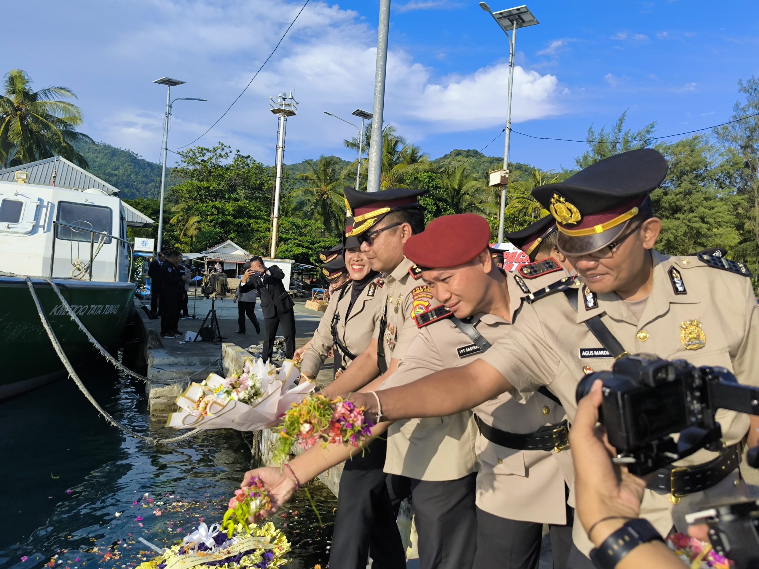 Lombok Utara, DS– Dalam rangka menyambut Hari Bhayangkara ke-79, Polres Lombok Utara menggelar upacara tabur bunga yang dilaksanakan di Pelabuhan Teluk Nara, Kecamatan Pemenang, Kabupaten Lombok Utara, Senin (23/6).