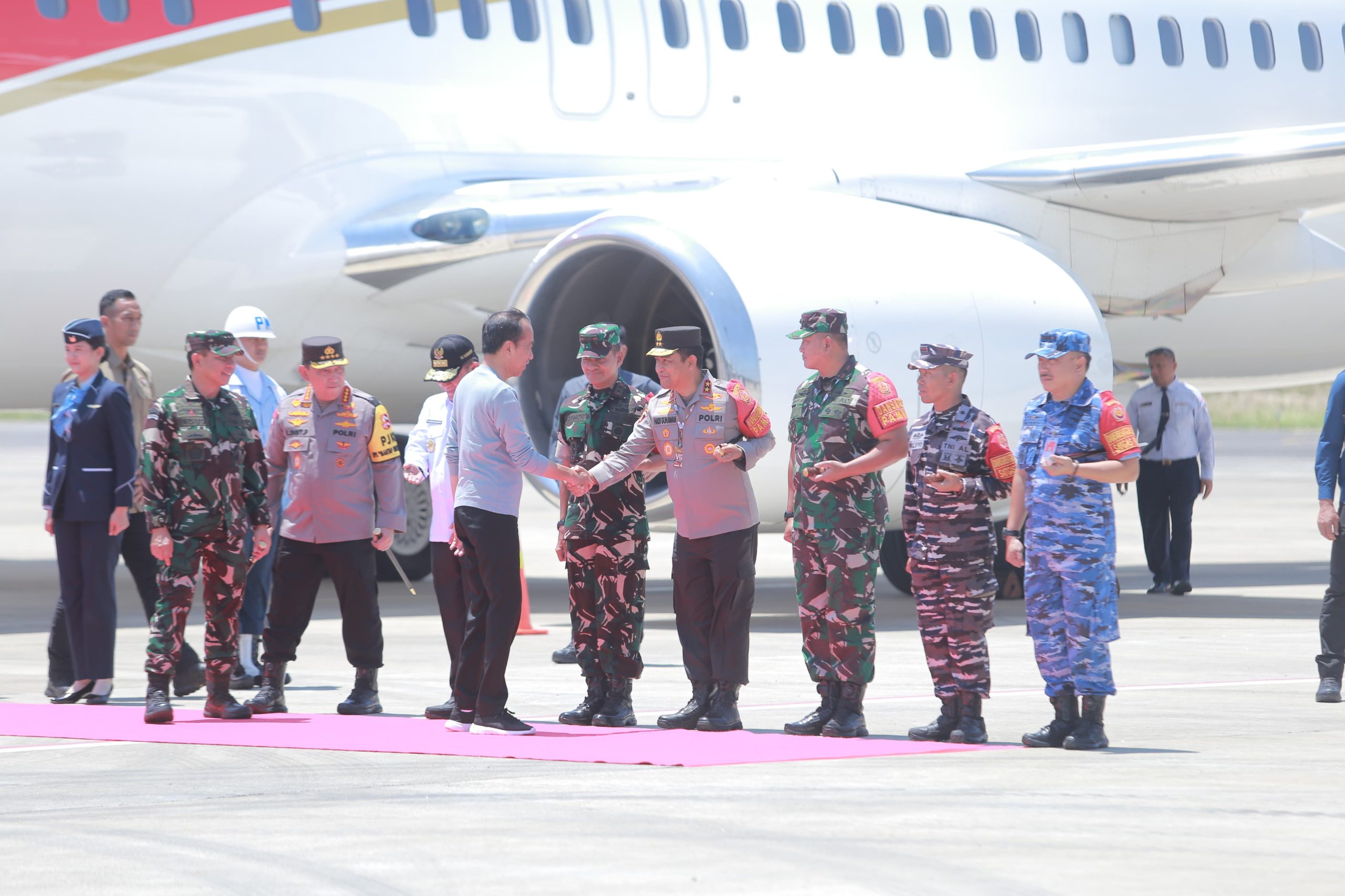 Turun dari pesawat kepresidenan, Presiden Jokowi langsung menapaki karpet merah yang telah disiapkan. Senyum ramahnya terlihat saat menyapa para pejabat yang menyambut kedatangannya.