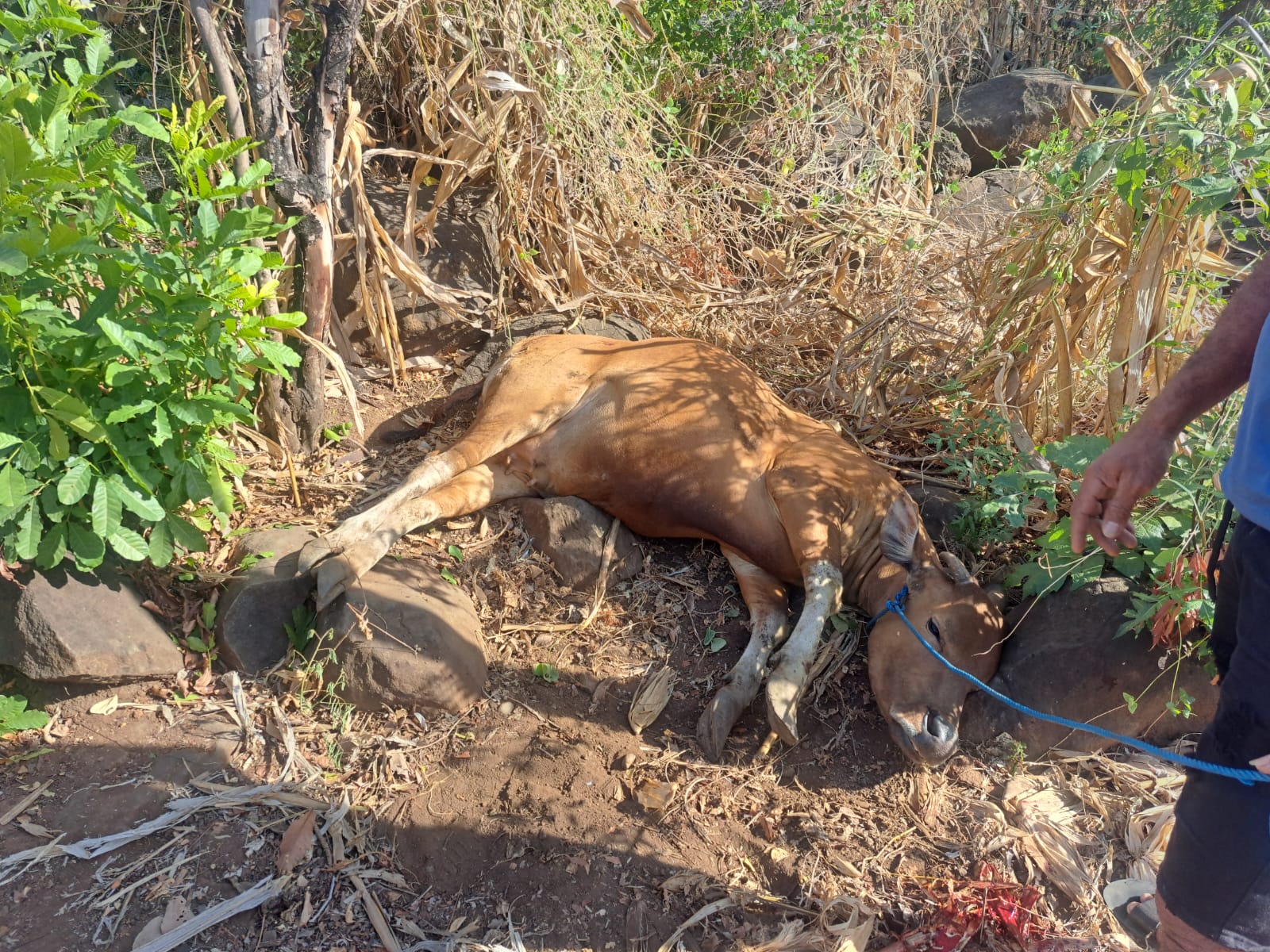 Warga menduga, sapi yang terjerat dalam kondisi kesakitan itu merupakan ternak yang gagal dicuri sehingga dilepas di tengah jalan.