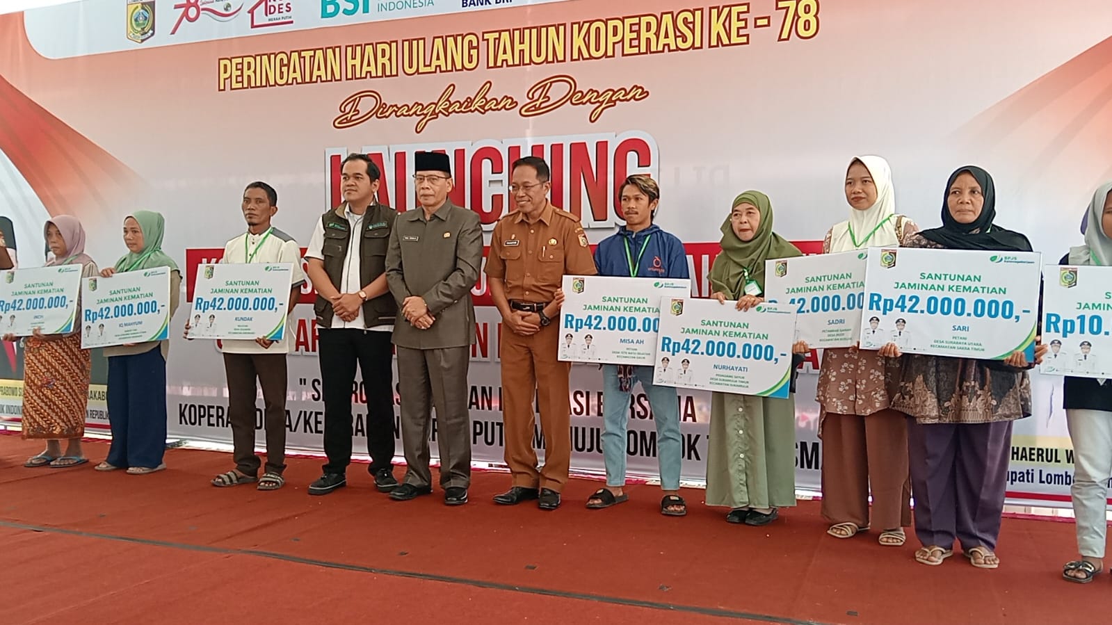 Penyerahan klaim jaminan sosial ke ahli waris peserta disaksikan pimpinan OPD, kepala desa dan pengurus koperasi merah putih yang menghadiri peluncuran 254 Koperasi Merah Putih dan peringatan Hari Koperasi yang digelar di Pendopo Bupati Lombok Timur.